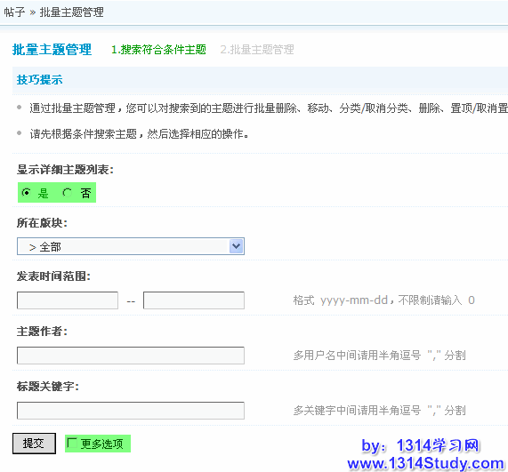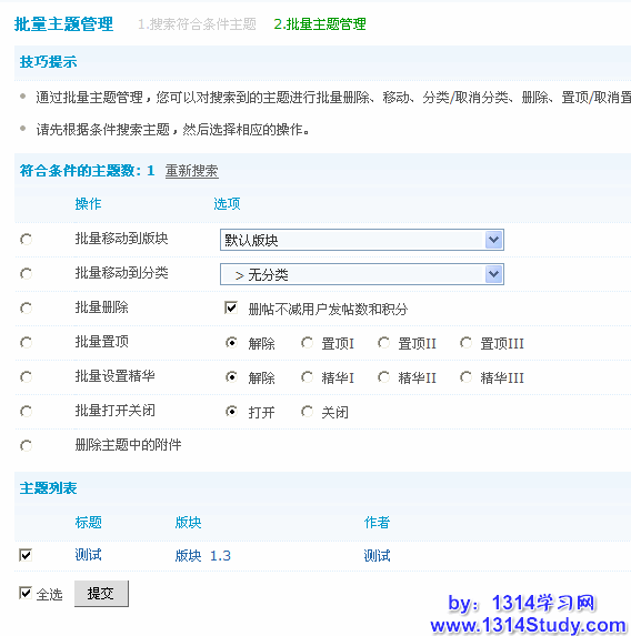 这个功能搜索出符合一定条件的主题,然后进行批量的操作。包括:批量移动到版块、批量移动到分类、批量删除、批量置顶、批量设置精华、批量打开关闭、删除主题中的附件。下面主要介绍一下这个功能的使用方法,进入系统后台 => 帖子 => 批量主题管理。