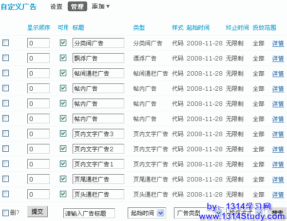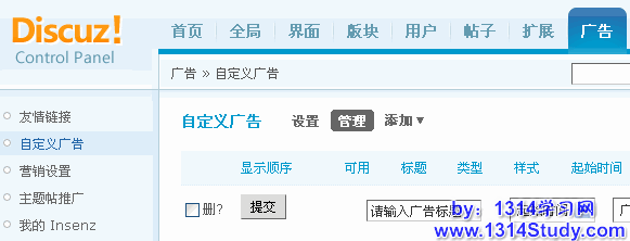 自定义广告可以在论坛进行商业宣传或品牌推广,对论坛发展有一定的推动,后台 => 广告 => 自定义广告,如图:
