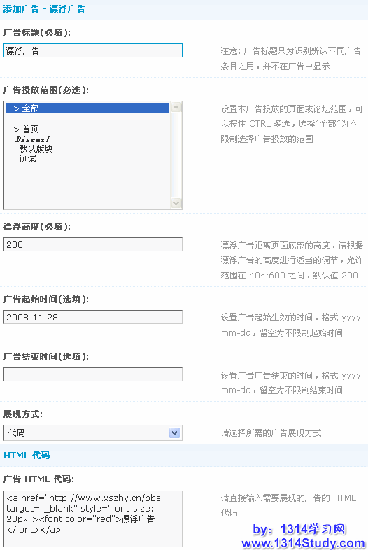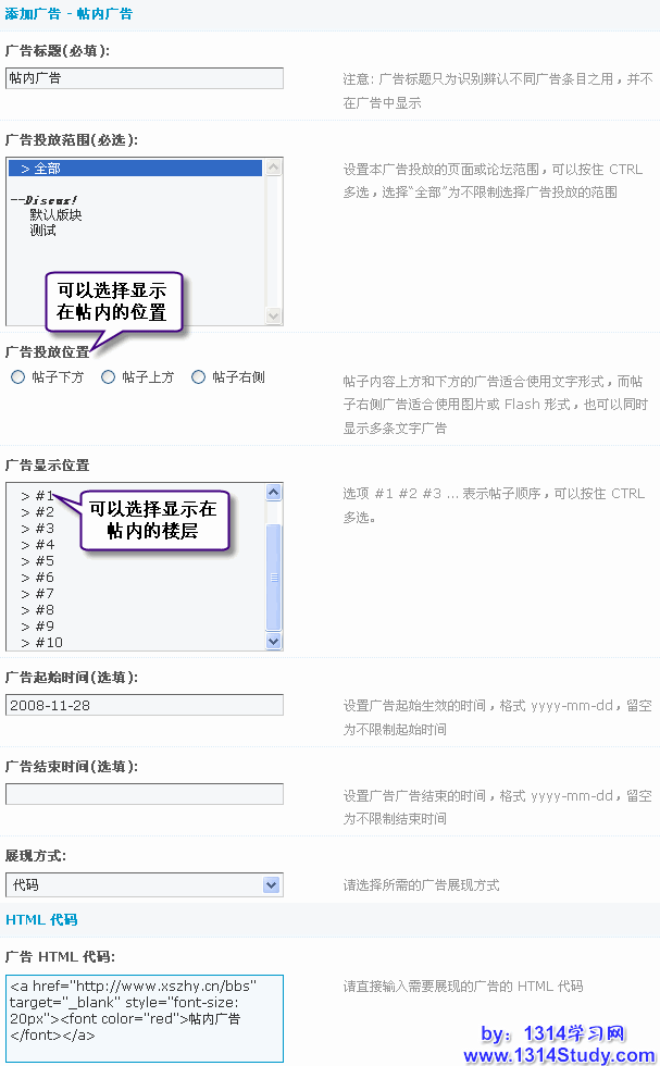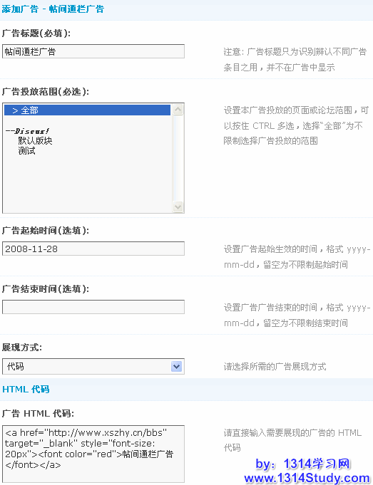 2)广告投放范围(必选):设置本广告投放的页面或论坛范围,可以按住 CTRL 多选,选择“全部”为不限制选择广告投放的范围;