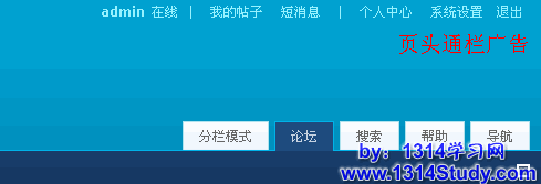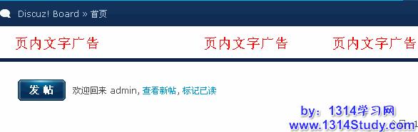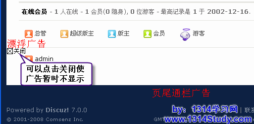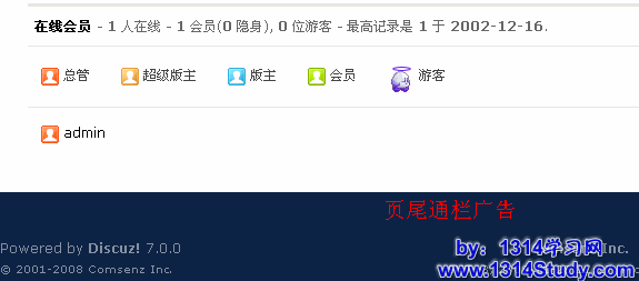 2、页尾通栏广告:页尾通栏广告显示于论坛页面中下方,通常使用 468x60 或其他尺寸图片、Flash 的形式。当前页面有多个页尾通栏广告时,系统会随机选取其中之一显示。