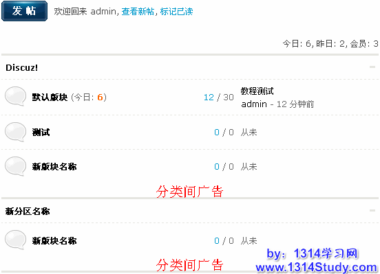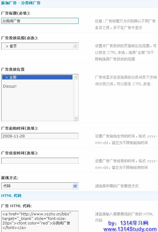 7、分类间广告:显示于论坛首页相邻的两个论坛分类之间,可使用 468x60 或其他尺寸图片和 Flash 的形式。当前页面有多个分类间广告时,系统会从中抽取与论坛分类数相等的条目进行随机显示。设置如图: