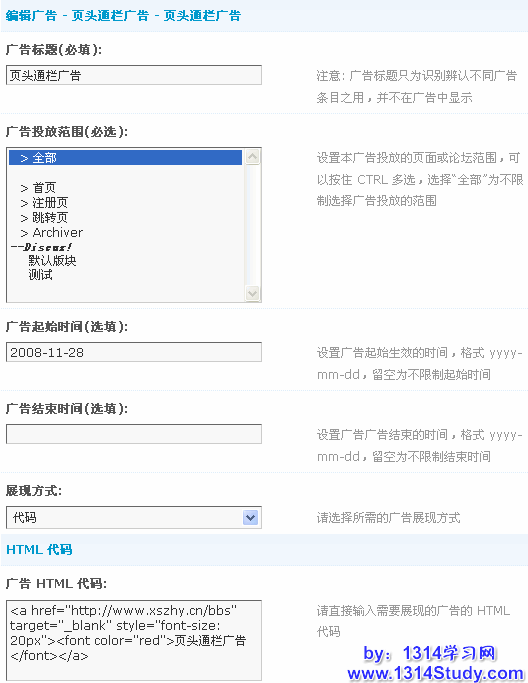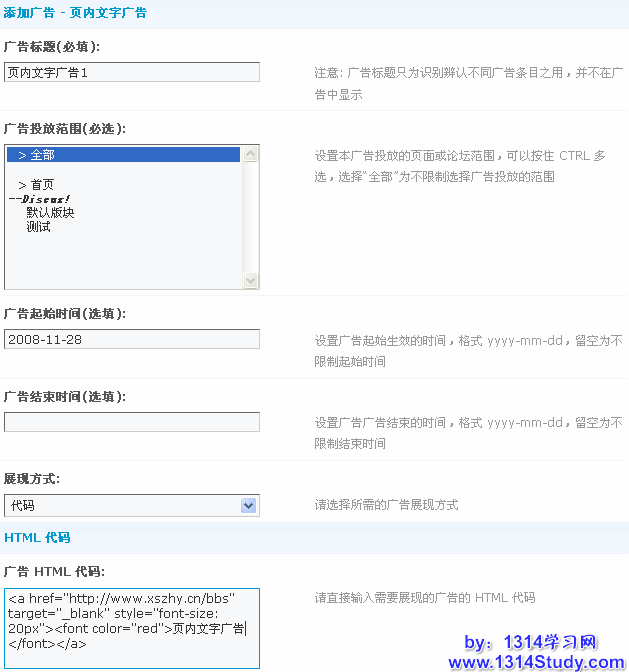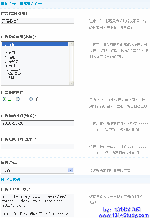 2)广告投放范围(必选):设置本广告投放的页面或论坛范围,可以按住 CTRL 多选,选择“全部”为不限制选择广告投放的范围