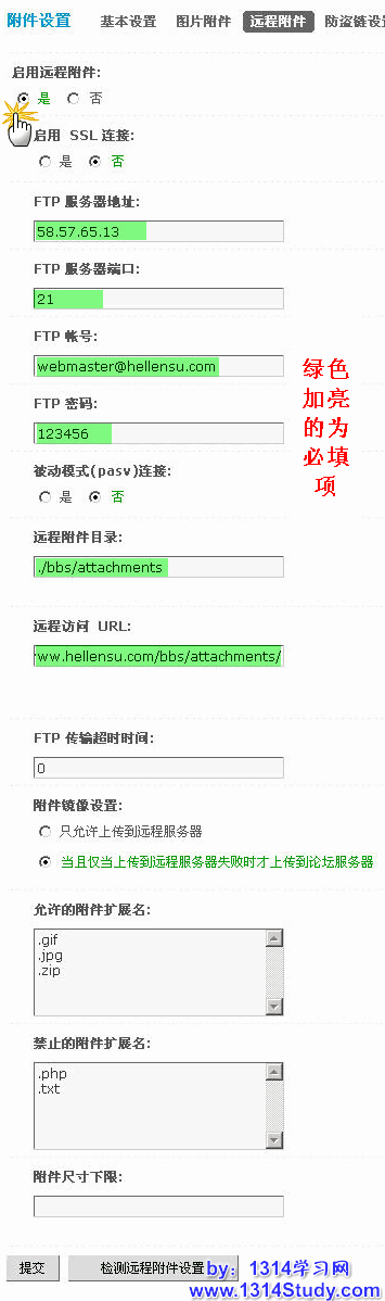 3)远程附件目录:远程附件目录的绝对路径或相对于 FTP 主目录的相对路径,结尾不要加斜杠“/”,“.”表示 FTP 主目录。