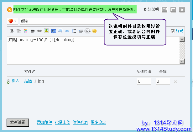 注意:如果这里填写错误或目录权限有误的话,在提交带附件的贴子时会出现如下提示:
