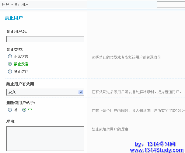 填入要禁止用户的用户名,选择禁止用户的类型,设置禁止用户的有效期,选择是否删除禁止用户的帖子,填写禁止会员的理由。