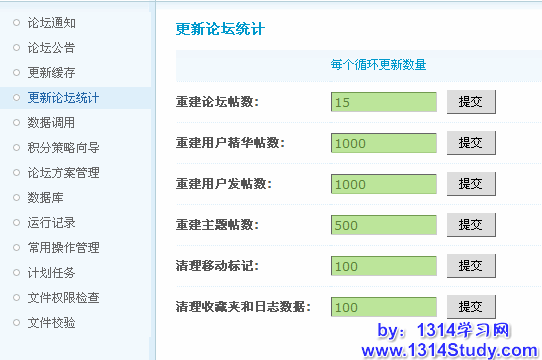 这就是以上六个项目的主要功能,那么更新统计之前,都有每次循环更新数量的设置,这个设置主要是为了防止一次更新太多,完成时间太长导致服务器超时而设置的,这样每次执行你设置的数目,然后自动跳转分批执行。