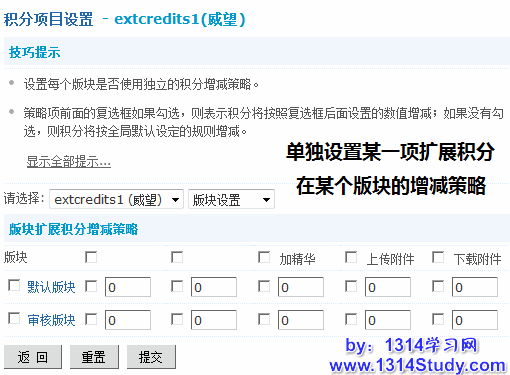 版块设置:设置某一种扩展积分在某个版块的积分策略。