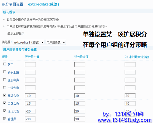 用户组设置:设置某个用户组参与某一种扩展积分的评分策略。
