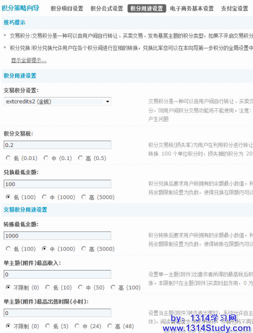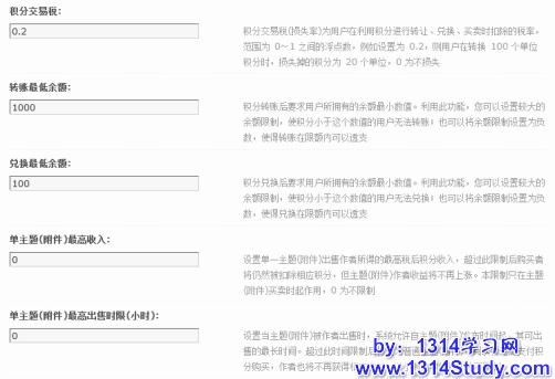 站长在系统设置里,可以分别设置:转账最低余额,兑换最低余额,单主题(附件)最高收入,单主题(附件)最高出售时限(小时)。