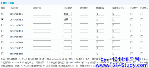 Discuz! 提供了8种扩展积分,站长可以灵活定义每种扩展积分的基本属性,包括:启用此积分,扩展积分图标,扩展积分名称,扩展积分单位,积分兑换比例,注册初始积分,允许兑出,允许兑入。