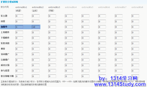 扩展积分增加策略的本质就是设置如何增加或者减少会员的某项扩展积分。举例说明:会员的某个主题加入精华之后,该会员的扩展积分将增加1个单位,威望将增加10个单位。如下图中有颜色标识的设置。