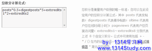 总积分是衡量用户级别的唯一标准,积分公式根据每个论坛的实际情况进行设置。举一例说明:每个会员的积分值=会员贴子数+会员在线时间*10。公式里的每个参数都有专门的表达式代替:posts 代表发帖数;digestposts 代表精华帖数;oltime 代表用户总在线时间(小时);pageviews 代表用户总页面访问量;extcredits1~extcredits8 分别代表8 个自定义积分。