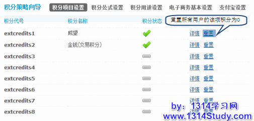 积分项目设置提供两个功能:1)单独每一种扩展积分的属性;2)重置用户积分。如下图:
