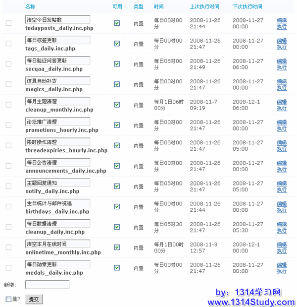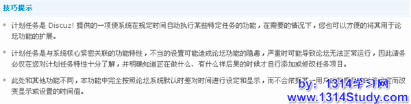 注意计划任务是与系统核心紧密关联的功能特性,不当的设置可能造成论坛功能的隐患,严重时可能导致论坛无法正常运行,因此请务必仅在您对计划任务特性十分了解,并明确知道正在做什么、有什么样后果的时候才