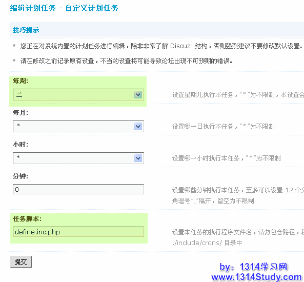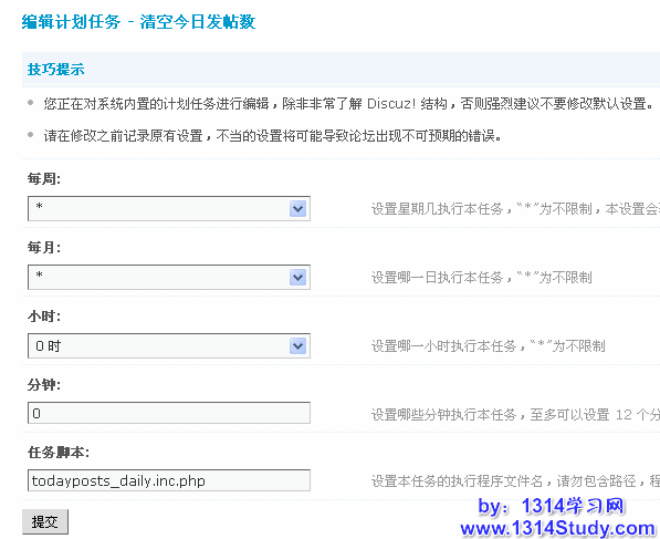 注意:除非您非常了解 Discuz! 结构,否则强烈建议不要修改计划任务的默认设置,并且在修改之前记录原有设置,不当的设置将可能导致论坛出现不可预期的错误。