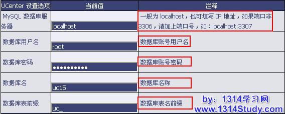 UCenter 和 Discuz! 数据库配置信息,这个您可以根据 UCenter 和 Discuz! 根目录下的 config.inc.php 来填写。