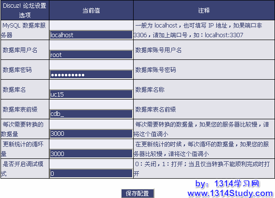(3)、UCenter 数据库配置信息的设置这个设置是转换到 Discuz! 7.0.0 必填的,按照您刚才安装 UCenter 是的数据库信息填写即可,可以参考 UCenter 根目录下的 config.inc.php 文件中信息。