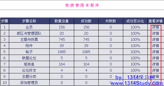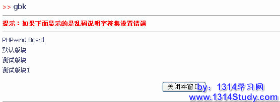 显示正常,可见,原论坛字符集是 GBK。点击”关闭本窗口“,即可回到刚才数据库配置信息界面。