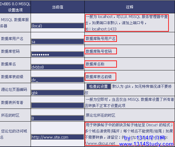 原 DvBBS 8.0 MSSQL 数据库配置信息,这个您可以参考原 DvBBS 8.0 MSSQL 数据库配置文件来填写。