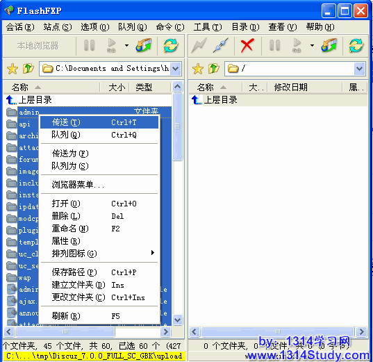 将其中 upload 目录下的所有文件使用 FTP 软件上传到空间,如下图所示: