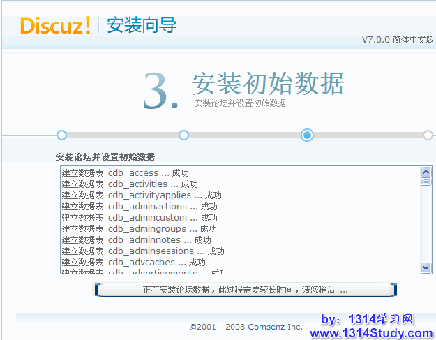 填写好 Discuz! 数据库信息及管理员信息后,点击“填写完毕,进行下一步”,系统会自动安装数据库直至完毕,如下图所示: