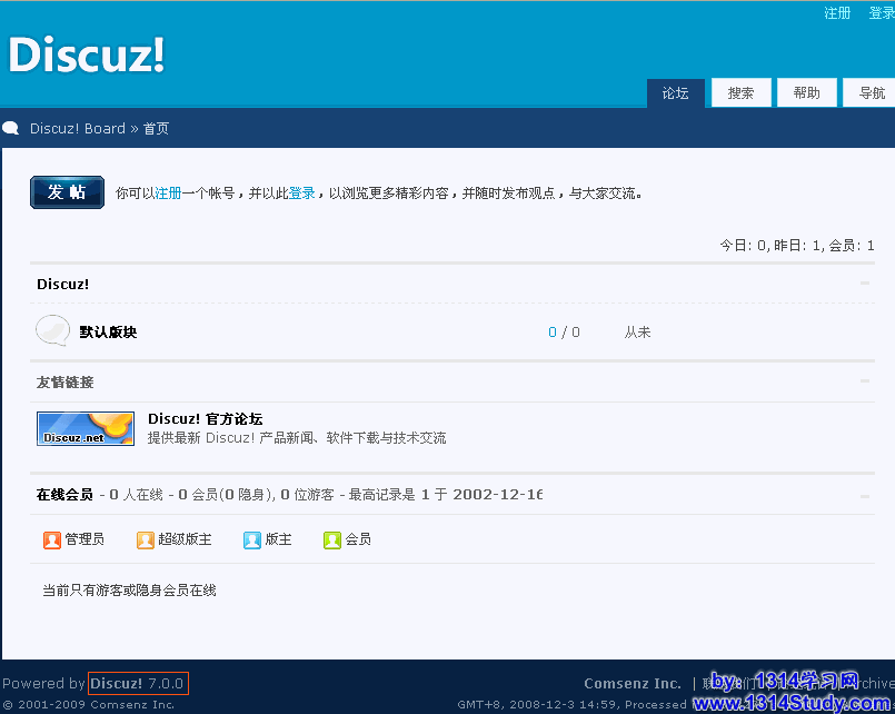 点击“您现在可以点击这里进入论坛”,即可进入安装好的 Discuz! 7.0.0 ,如下图所示: