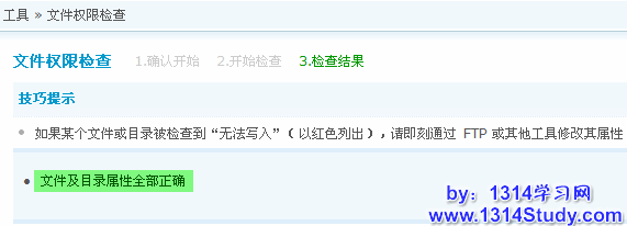 可以通过校验结果检查网站文件权限是否设置正确,设置文件权限的方法请参考:http://www.discuz.net/viewthread.php?tid=487165