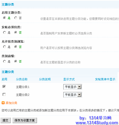 启用主题分类:设置是否在本版块启用主题分类功能,您需要同时设定相应的分类选项,才能启用本功能。