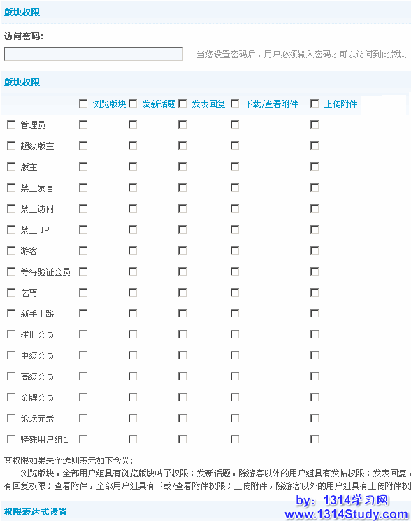 权限设置:访问版块密码、浏览版块许可、发新话题许可、发表回复许可、下载/查看附件许可、上传附件许可、权限表达式。