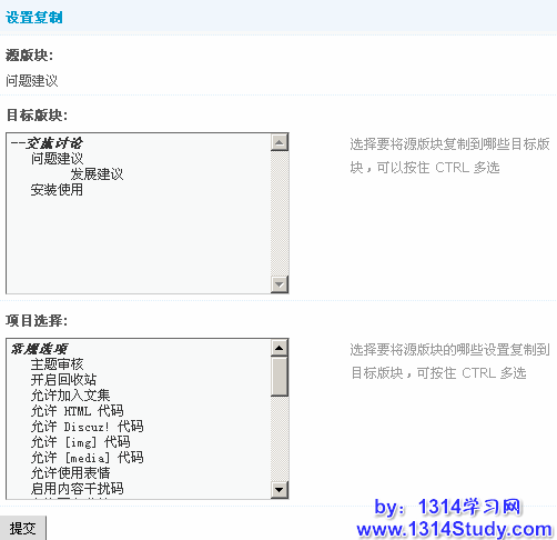 注意:版块设置复制一旦提交立即生效,并无法恢复,请仔细选择目标版块和设置项目。