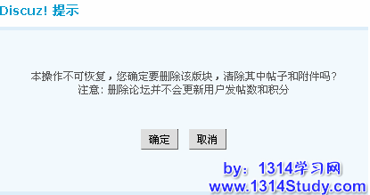 点击“确定”将会删除版块,并且会清除其中帖子和附件,但是不会更新用户发帖数和积分。