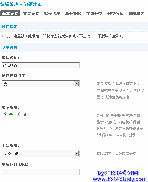 从上面导航栏可以选择“基本设置”,“扩展设置”,“帖子选项”,“积分策略”,“主题分类”,“分类信息”和“权限相关”进行设置。