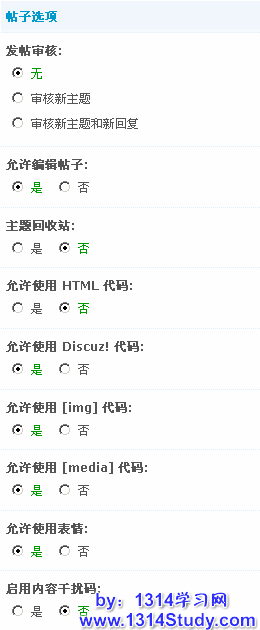常规选项:主题审核、开启回收站、允许加入文集、允许 HTML 代码、允许 Discuz! 代码、允许 [img] 代码、允许 [media] 代码、允许使用表情、启用内容干扰码、允许匿名发