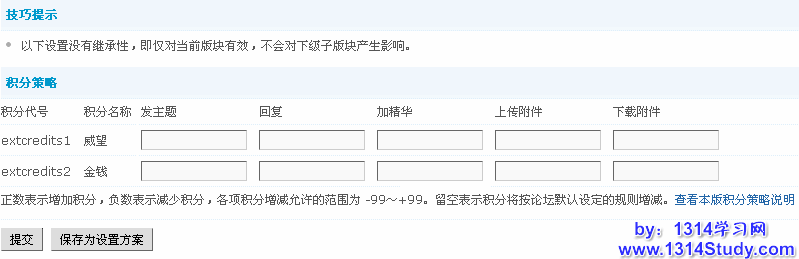积分设置:发新话题积分策略、发新回复积分策略。