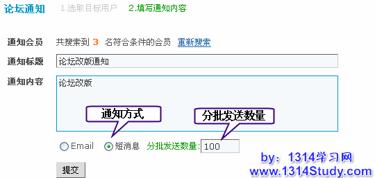 搜索出符合条件的用户后,即可填写通知内容和标题,下图所示: