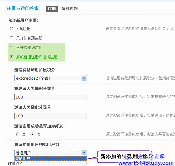 1)允许新用户注册:选择“只开放邀请注册”或者“开放普通注册和邀请注册”。