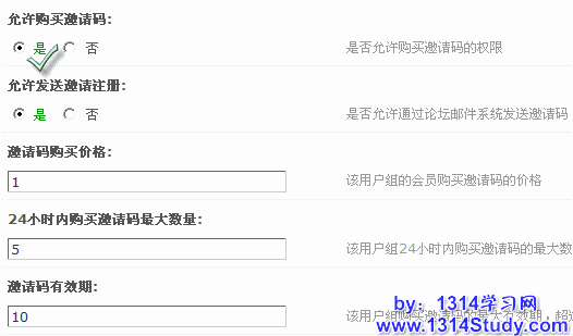 2)允许发送邀请注册:是否允许通过论坛邮件系统发送邀请码。选择“是”,则该用户组的用户可以通过论坛邮件系统发注册邀请码给自己的朋友用于注册,并且发送后该邀请码自动标记为“已发送”;选择“否”,则不允许该用户组的用户通过论坛邮件系统发送邀请码给自己的朋友。