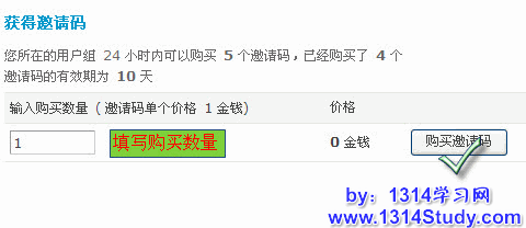 当用户要获取邀请码时,到“获得邀请码”下的文本框中输入购买邀请码的数量,然后点击“购买邀请码”按钮。如下图所示: