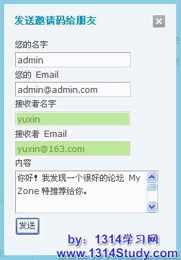 用户可以点击“复制”或者选中邀请码前的复选框,然后点击“复制所选邀请码”按钮,将邀请码复制到剪贴板中。当然你还可以通过论坛邮件系统发送邀请码,点击上图中的 “发送”,进入如下图所示的界面:填写接受者的 用户名 和 E-mail 就可以发送了。
