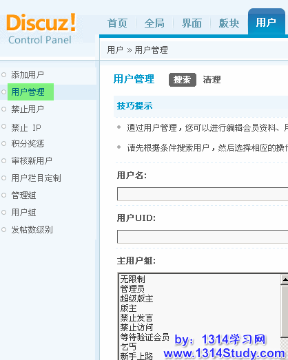 管理员登录论坛后台 => 用户 => 用户管理,如下图所示: