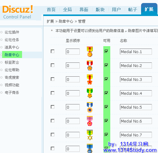 需要到“勋章中心”启用勋章后有效,位置在:论坛后台 => 扩展 => 勋章中心,设置为可用,如下图所示: