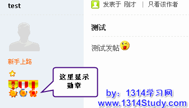 这样就可以为会员颁发勋章了。会员在论坛发新帖或回复后,头像下面就会显示勋章,效果如下图所示: