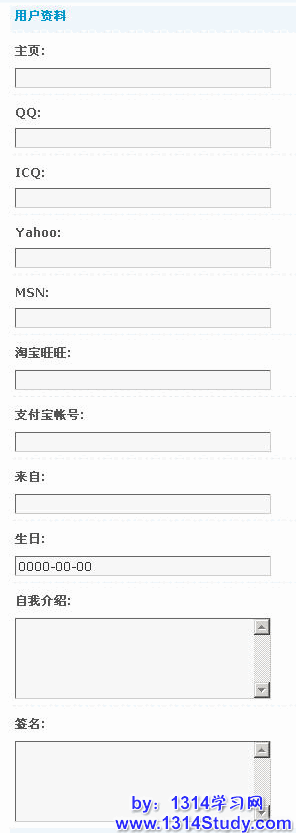 其中包括主页、QQ、ICQ、Yahoo、MSN、淘宝旺旺、支付宝帐号、来自哪里、生日、自我介绍、签名。