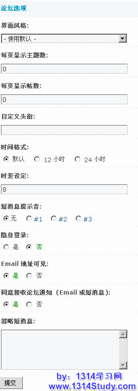 可以选择会员的界面风格、每页显示主题数、每页显示帖数、自定义头衔、时间格式、短消息提示音、是否隐身登录、Email 地址是否可见、是否同意接收论坛通知、以及忽略短消息。