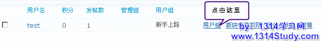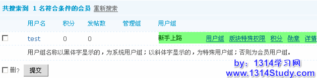 说明:通过用户管理,您可以进行编辑会员资料、用户组、权限、积分,授予会员勋章以及删除会员等操作。