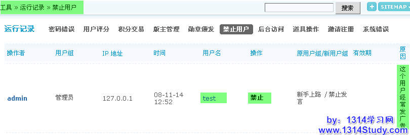 填写完操作理由,提交后到后台的 => 工具 => 运行记录 => 禁止用户里可以看到如下图所示的内容: