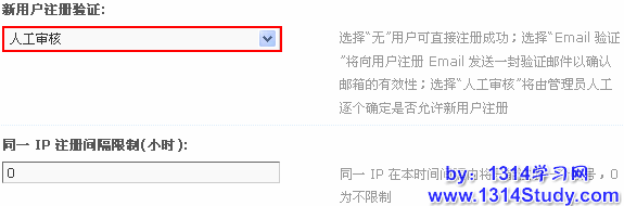 这里选择“人工审核”,即可开启管理员人工审核新注册用户的功能。