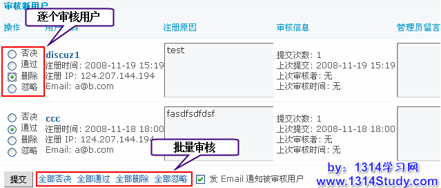 在 Discuz! 中,做为管理员,您可以对新注册的用户进行审核,以确定是否允许该用户注册。下面请看详细介绍: