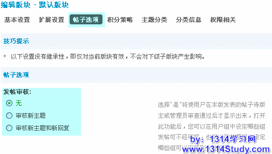 选择您想设置审核的版块,在这里选择默认版块,点击后面的编辑,即可在“帖子选项”中看到发帖审核的设置,如图所示: