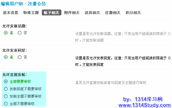 2、设置论坛中发帖需要经过审核的用户组;